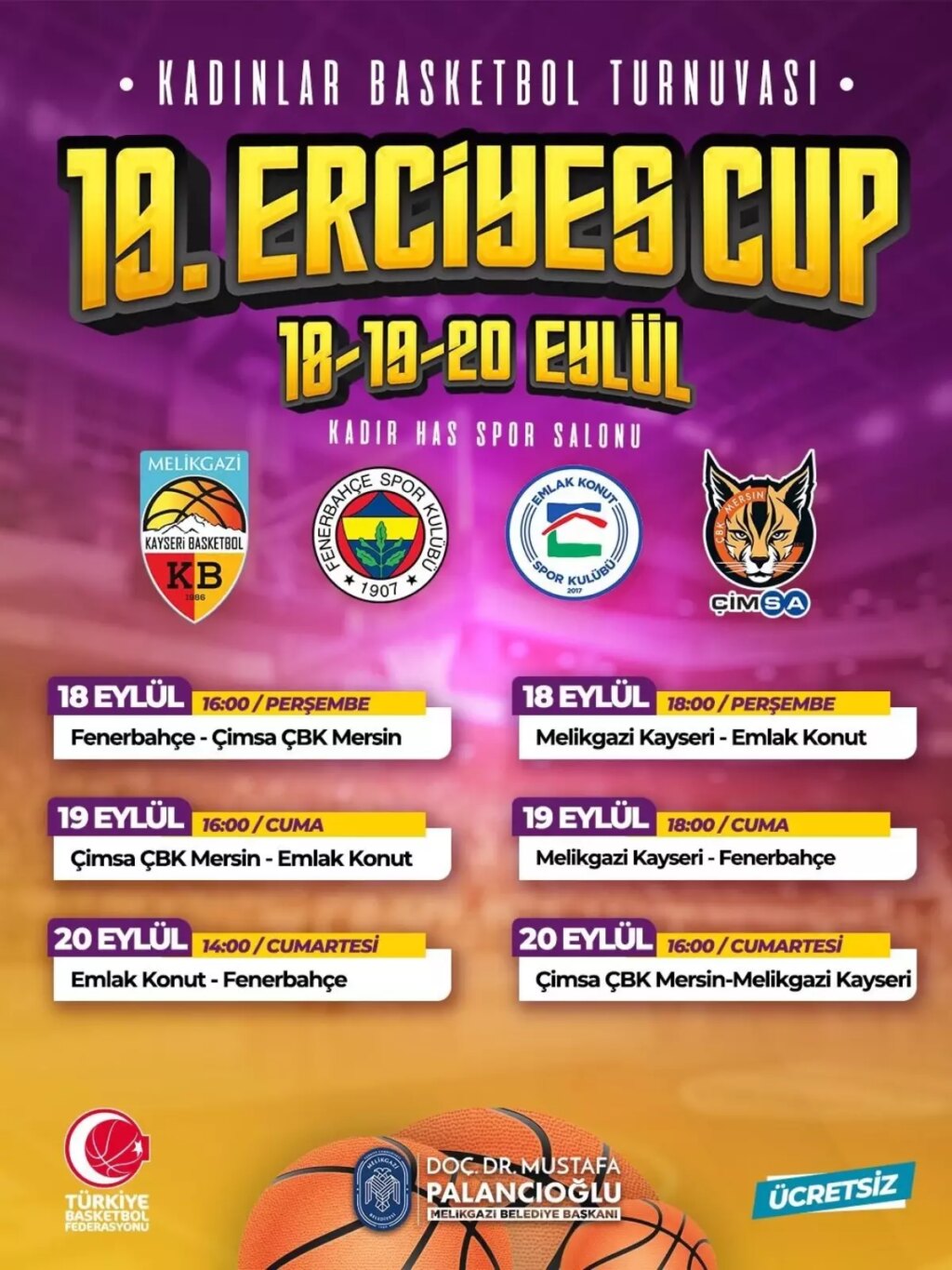 Kadınlar Basketbol Süper Ligi gruplarından Melikgazi Kayseri Basketbol tarafından düzenlenen 19’uncu Erciyes Cup hazırlık turnuvası 4 kadronun iştirakiyle 18 – 20 Eylül tarihleri ortasında yapılacak. Kadir Has Kongre ve Spor Salonu’nda oynanacak karşılaşmalara mesken sahibi Melikgazi Kayseri Basketbol dışında Fenerbahçe, ÇBK Mersin ve Emlak Konut katılacak. Turnuva yarın başlayacak.