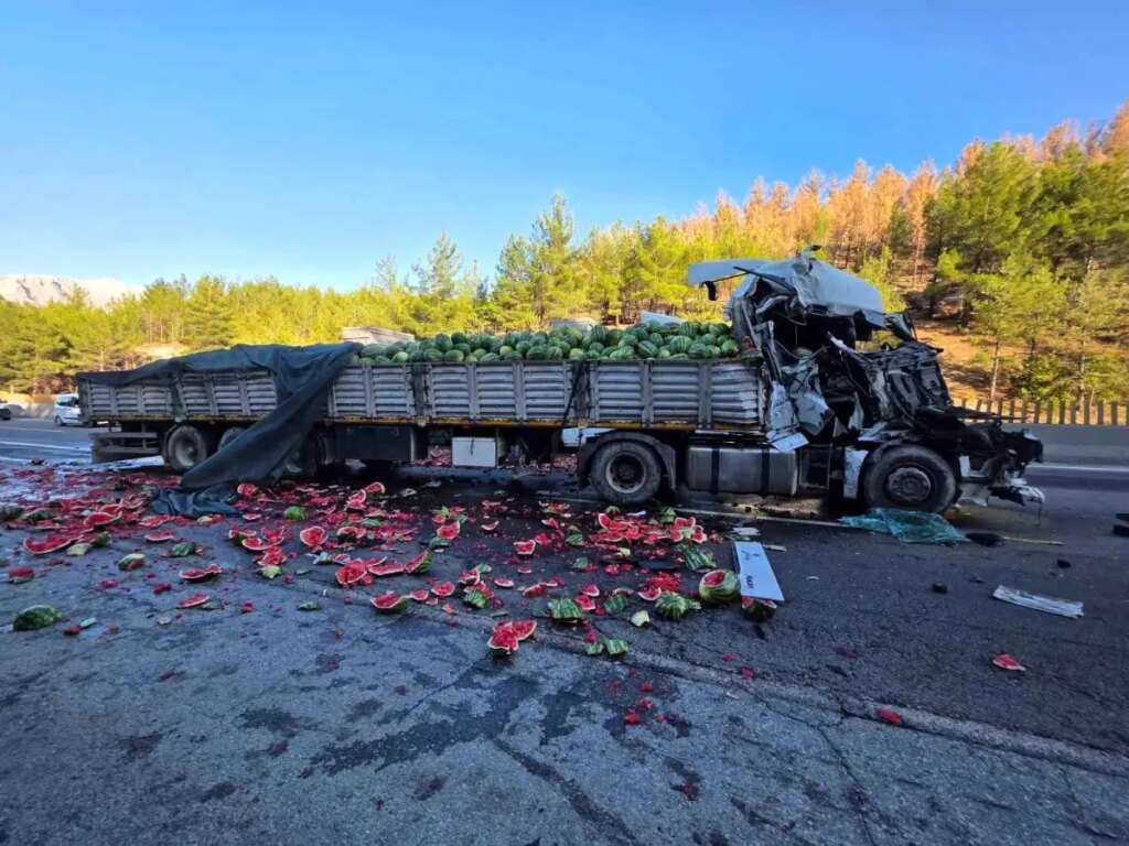 Adana- Pozantı otoyolunda karpuz yüklü tır diğer bir tıra geriden çarparak devrildi. Karpuzlar otoyola saçıldı.