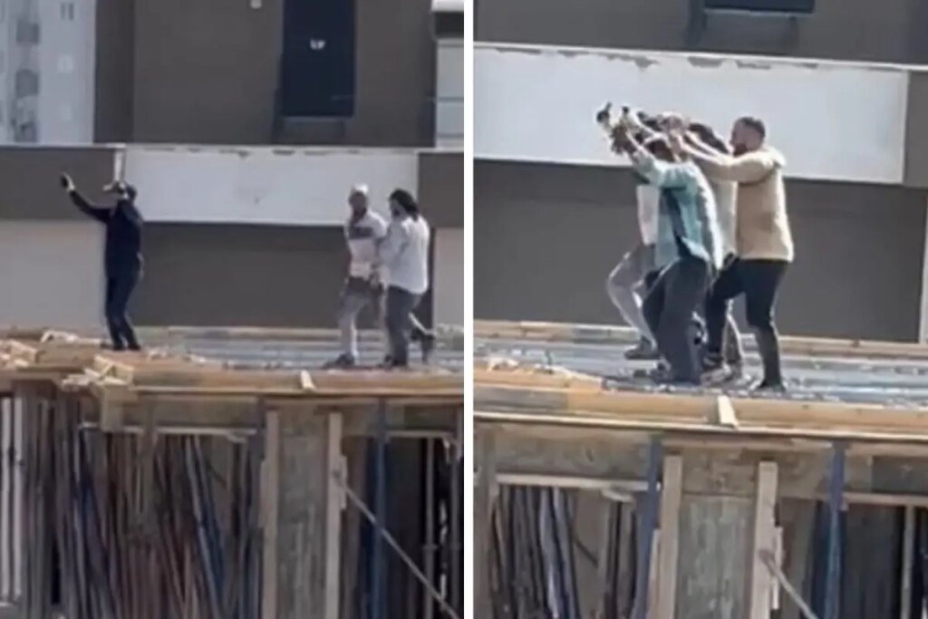 Bir emekçi evvel elindeki kerpetenle birlikte dans etmeye başladı. Yerden metrelerce yükseklikte müziğin ritmine kapılan çalışana öbür arkadaşları da katılarak halay çekmeye başladı.