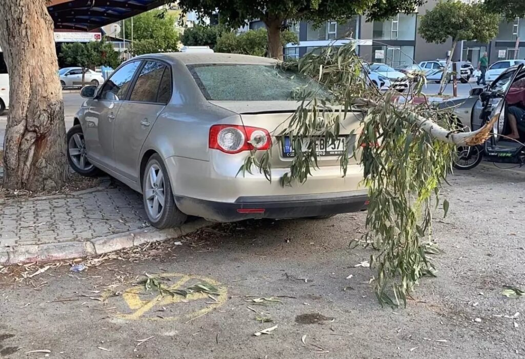 Mersin’in Faziletli ilçesinde kırılan ağaç kısmı arabaya ziyan verdi.