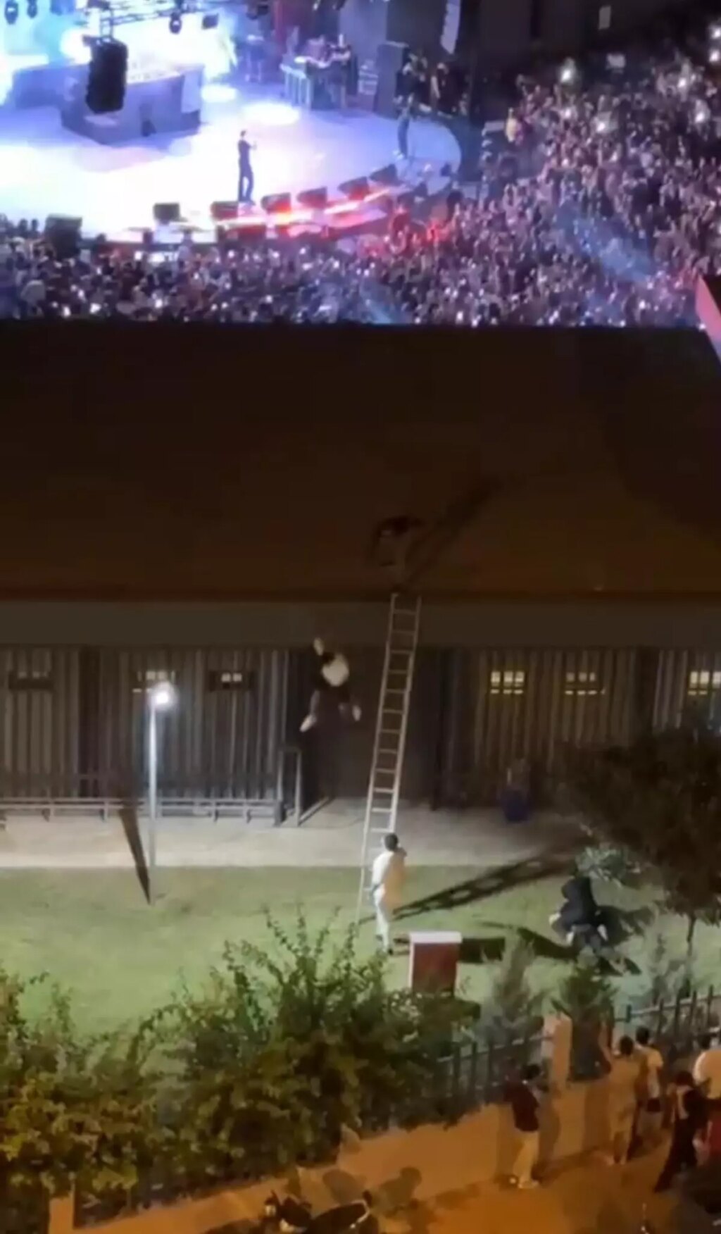 MERSİN’de düzenlenen konseri, binanın çatısına çıkarak izlemeye çalışan gençlerden biri aşağı atıldı, oburu darbedildi. Cep telefonuyla görüntülenen olayla ilgili Cumhuriyet Başsavcılığı soruşturma başlattı.
